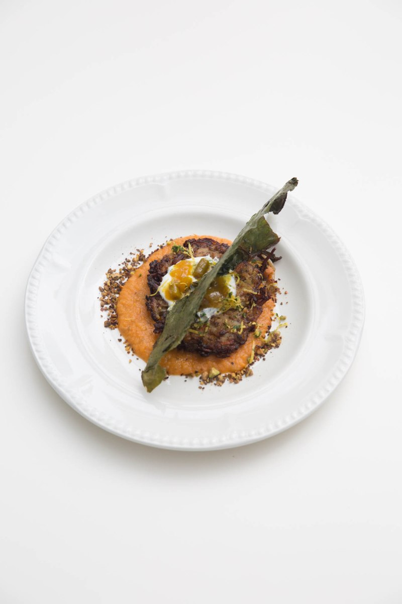 Anna Loka’s Mixed vegetable rosti in a butternut marinara and crispy fried greens