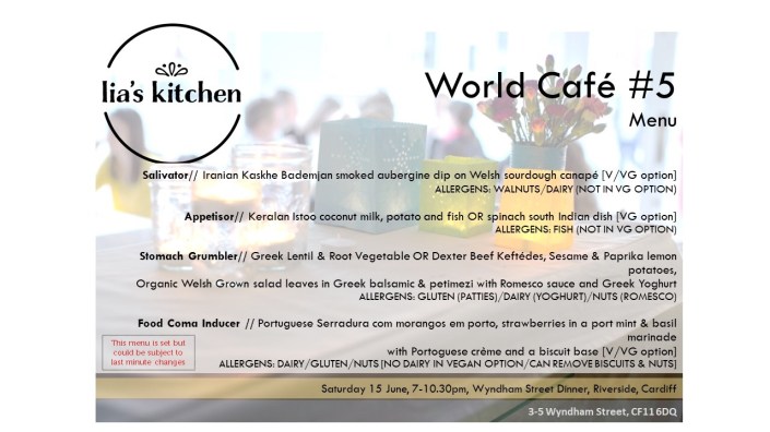 On Saturday 15 June 2019 I am celebrating the return of Lia’s Kitchen World Café. The night returns to a new location at Riverside in Cardiff. It brings some of the Kitchen’s loved dishes from past events to your table.