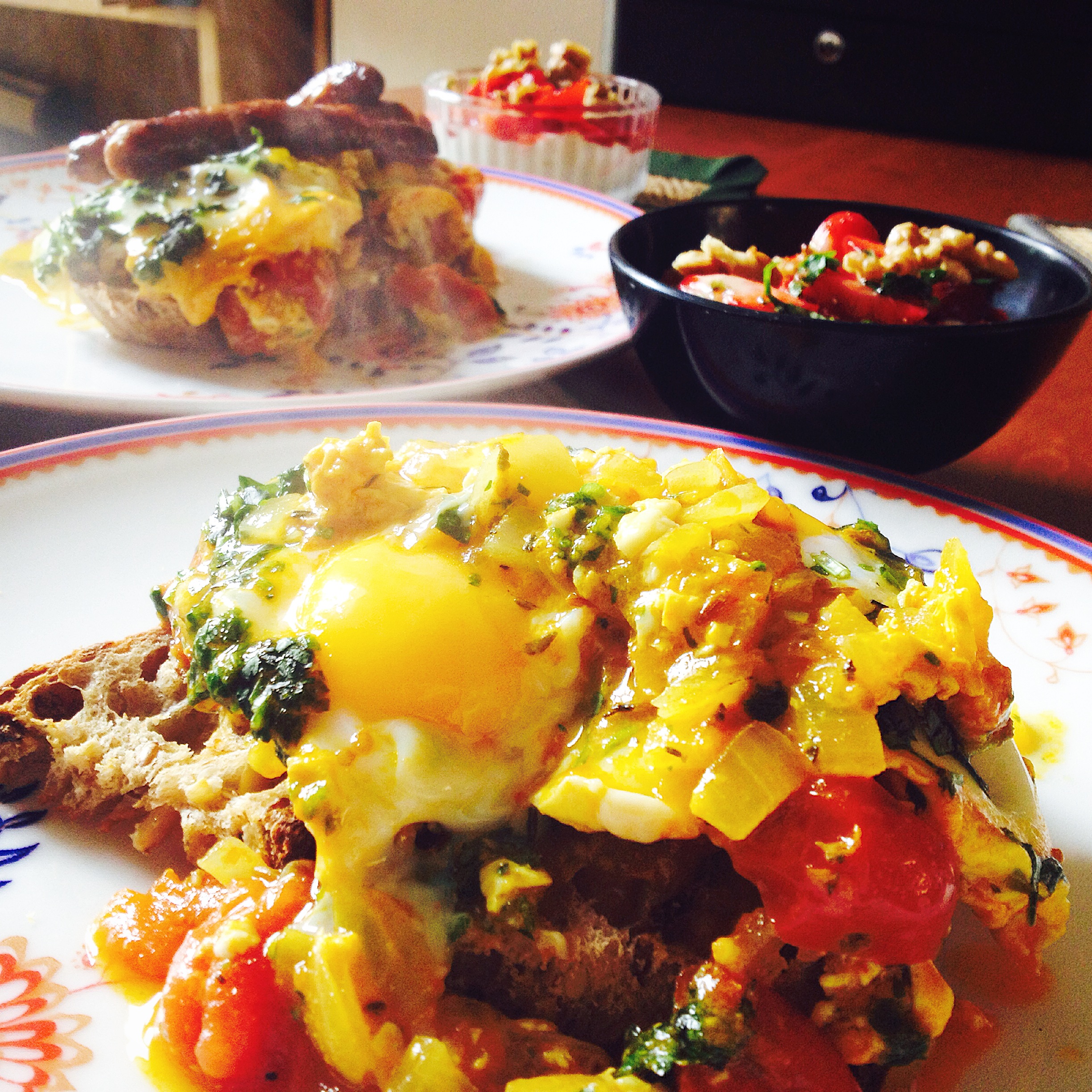 I have grown up with the Greek strapatsada as a summer dish or an easy dinner, in fact it is one of the first meals I ever cooked. Whilst strapatsada uses subtle flavours such as green peppers, pepper, basil or parsley and scrambles the eggs with feta cheese, shakshuka gains its distinctive flavour from spices such as (at least) cumin and turmeric, and requires that you poach the eggs towards the end of the cooking process.
